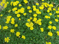 This is the second time the knock out roses have bloomed along side the yellow daisies.
